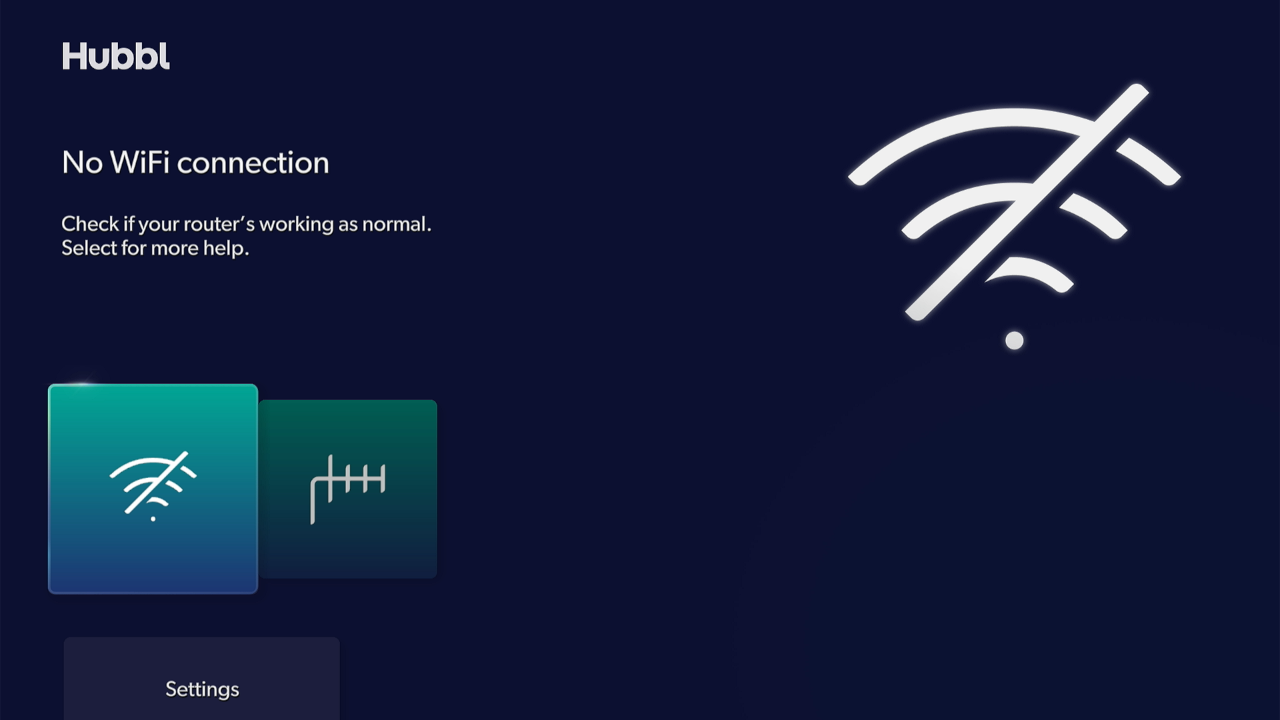 - Connect the Hubbl device to power again. You'll see “No WiFi connection” on screen - scroll down and select Settings .